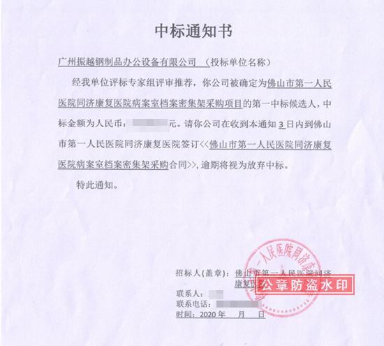 經(jīng)過公司專業(yè)團(tuán)隊制作標(biāo)書,密封完整后遞交給了醫(yī)院招標(biāo)部,再陸續(xù)經(jīng)過醫(yī)院招標(biāo)辦專家各方面綜合對比,最終得出由我公司廣州振越鋼制辦公設(shè)備有限公司中標(biāo)。在中標(biāo)后的2個工作日內(nèi),我公司安排了專業(yè)的人員勘察現(xiàn)場,經(jīng)過現(xiàn)場實地測量勘察,現(xiàn)場尺寸符合醫(yī)院招標(biāo)要求,可按照招標(biāo)要求生產(chǎn)密集架尺寸。