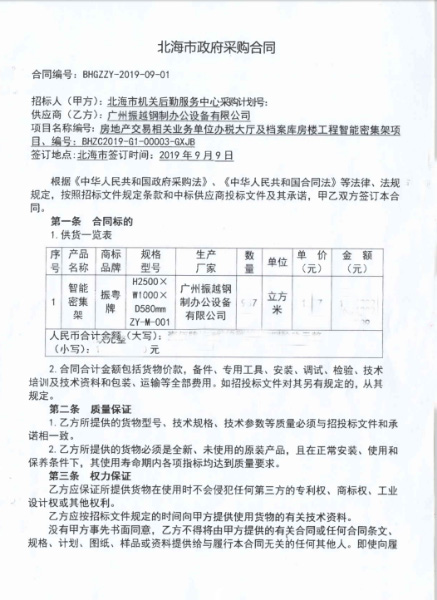 因此想采購(gòu)一批智能密集架、想詢找廣西或廣東生產(chǎn)密集架的廠家, 并有智能電動(dòng)密集架資質(zhì)的公司2019年8月份進(jìn)行公共投標(biāo),通過(guò)激烈的競(jìng)標(biāo)甄選,最終篩選了我們公司,廣州振越公司生產(chǎn)的智能檔案密集架。